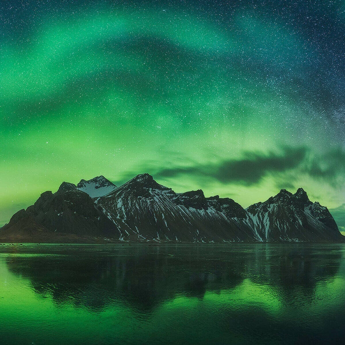 Μετά το πρωινό, αναχωρούμε για μία από τις πιο ατμοσφαιρικές τοποθεσίες της ανατολικής Ισλανδίας, το Stokksnes. Πρόκειται για μια εντυπωσιακή χερσόνησο με μαύρη ηφαιστειακή άμμο και αμμόλοφους, που απλώνεται μπροστά από το επιβλητικό βουνό Vestrahorn, ένα από τα πιο φωτογραφημένα βουνά της χώρας.
